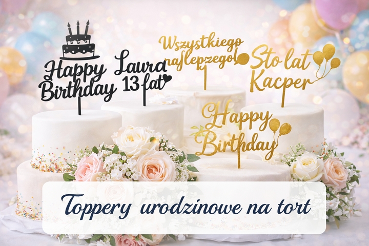 W tej kategorii znajdują się toppery przeznaczone do dekoracji tortów urodzinowych – czytelne, lekkie i dopasowane do różnych stylów oraz wieku solenizanta. Różnorodność wzorów i form pozwala dobrać topper odpowiedni zarówno na urodziny dziecka, jak i osoby dorosłej.