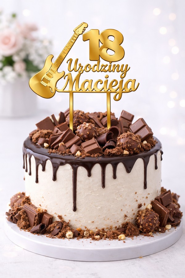 Elegancki topper z okazji 18 urodzin to wyjątkowa dekoracja, która podkreśli charakter uroczystości. Ozdoba przedstawia liczbę 18, napis urodzinowy oraz motyw gitary, dzięki czemu doskonale sprawdzi się podczas imprez muzycznych oraz tematycznych.