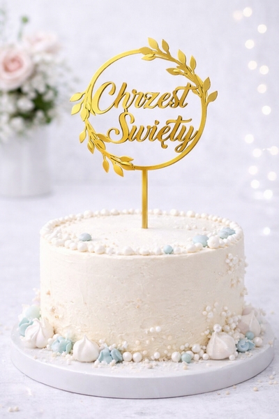 Stylowy topper z napisem „Chrzest Święty” to elegancka dekoracja podkreślająca wyjątkowy charakter uroczystości. Ozdoba wykonana została w formie subtelnego wianka z dekoracyjnymi listkami, który nadaje całości delikatny i uroczysty wygląd.