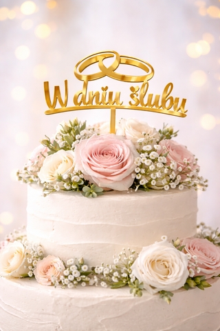 Elegancki topper dekoracyjny z napisem „W dniu ślubu”, zaprojektowany jako subtelny akcent podkreślający wyjątkowy charakter uroczystości. Prosta forma i estetyczne wykonanie sprawiają, że topper doskonale komponuje się z innymi aranżacjami ślubnymi.
